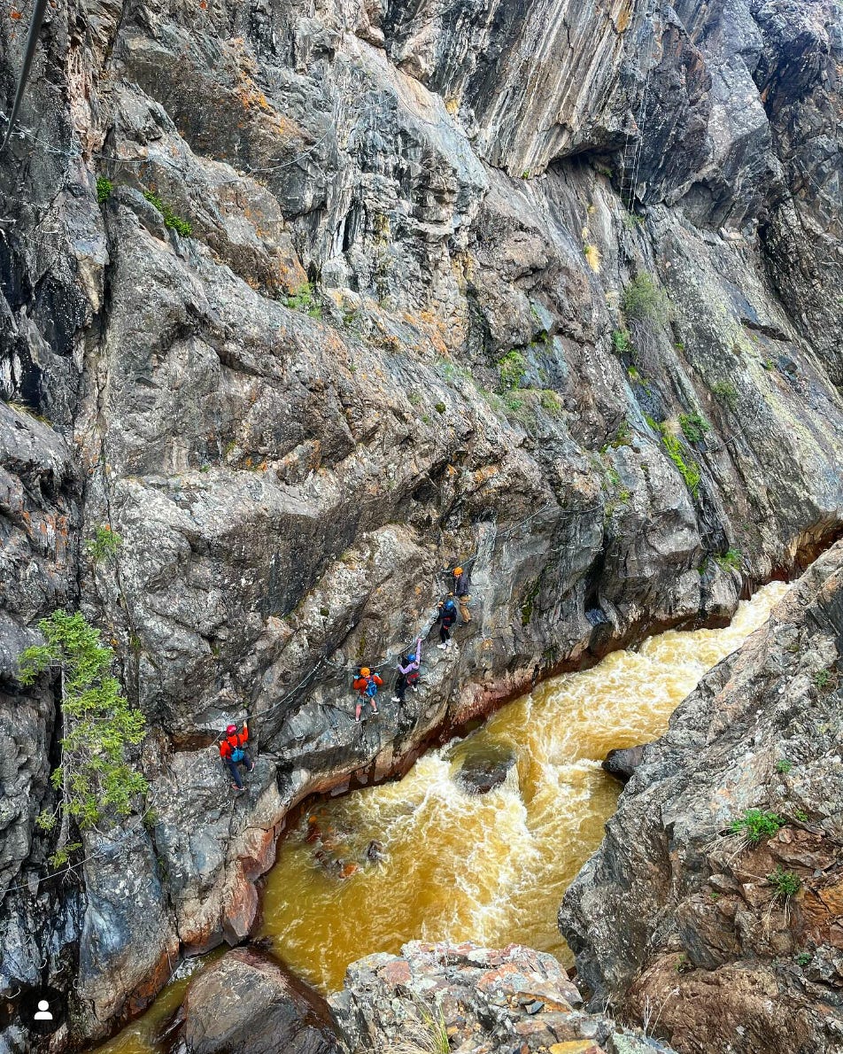 The high point of the climb for me was an unnamed wall boasting a steep set of rungs that took us up-up-up above the river. Don’t look down, they say, but man, I loved looking down. This was one of a few moments when I actually felt strong, and Shawn and I exchanged a distanced high-five when I reached the top, since he was cruising along ahead of me. Later, I had a funny moment when I hit a blind corner and wasn’t sure where to go. I cautiously peeked around the corner to see Shawn hanging out on a vertical cliff a few feet away, grinning at me like “get a move on, Jodi!” So I had to basically swing around that corner, which was totally exposed, and straddle the rock to reach the rungs. Then it was a fun down climb, and some kind of boulder problem that everyone else seemed to breeze through, while I had to flail and flounder to get it done.